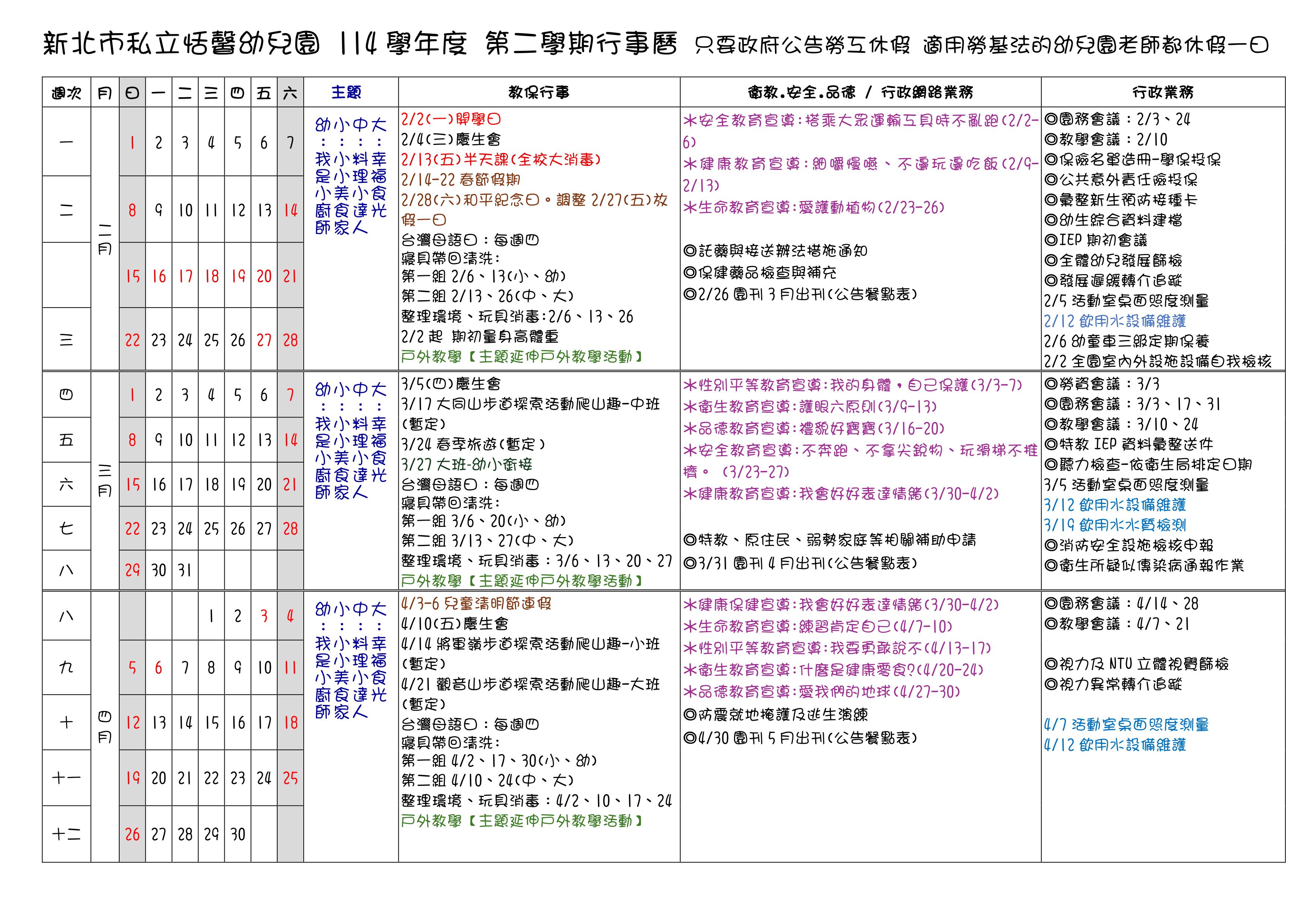 恬馨幼兒園-114學年度下學期行事曆